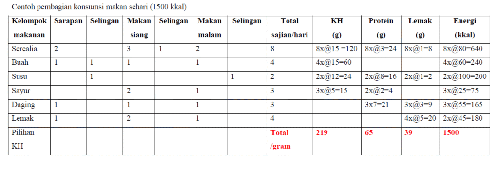Penghitungan karbohidrat adalah metode penting dalam pengelolaan diabetes yang membantu pasien menyesuaikan asupan karbohidrat agar kadar gula darah tetap stabil. Satu satuan karbohidrat biasanya setara dengan 15 gram karbohidrat. Dengan mengetahui jumlah karbohidrat yang dikonsumsi, pasien dapat mengatur dosis insulin atau obat hipoglikemik oral secara tepat dan menghindari hiperglikemia. Pendekatan ini juga membantu dalam merencanakan pola makan yang seimbang dan konsisten. Untuk contoh tabel perhitungan dapat dilihat dibawah ini